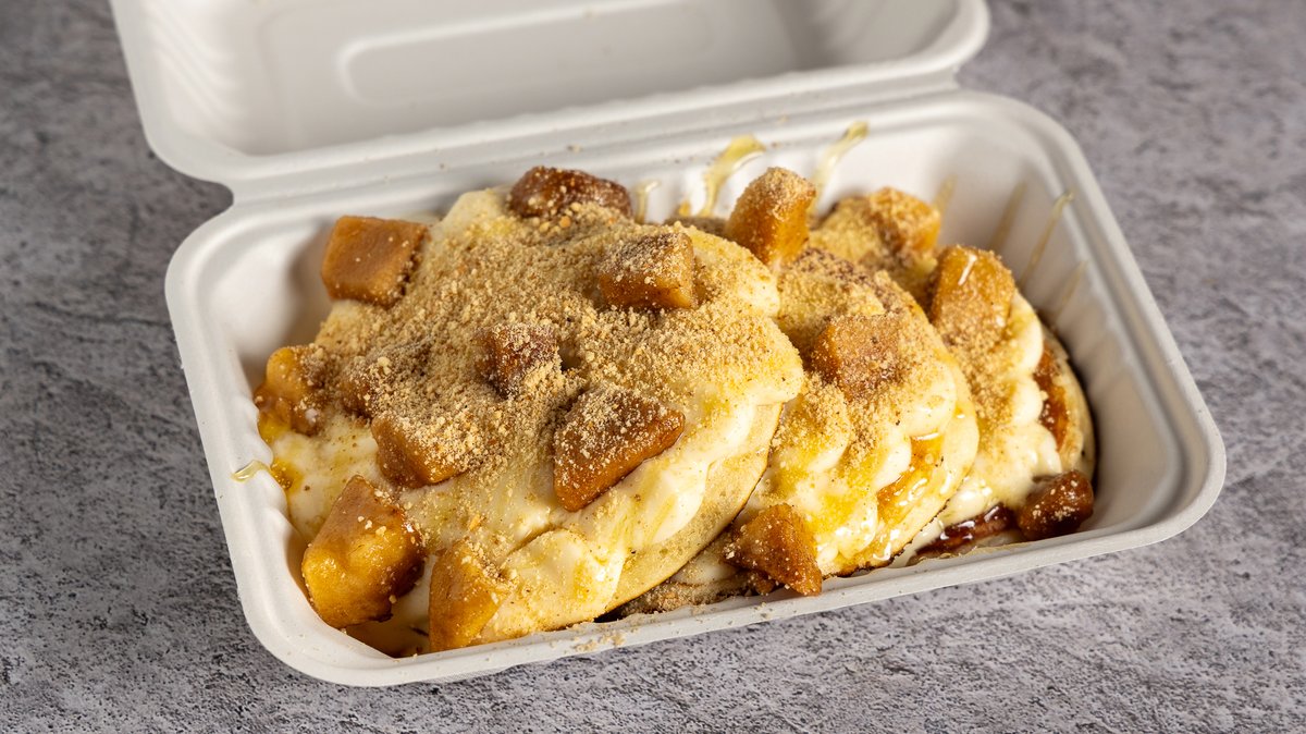 Αφράτα Pancake με American cheddar, bacon, sweet chilly mayo, τηγανητό κρεμμύδι και τηγανητό αυγό