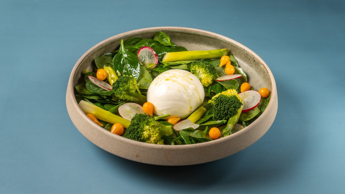 Σε προζυμένιο ψωμί σχάρας ολικής άλεσης, μους αβοκάντο, αυγό ποσέ, πίκλα αγγούρι, πιπέρι και δροσερή σαλάτα