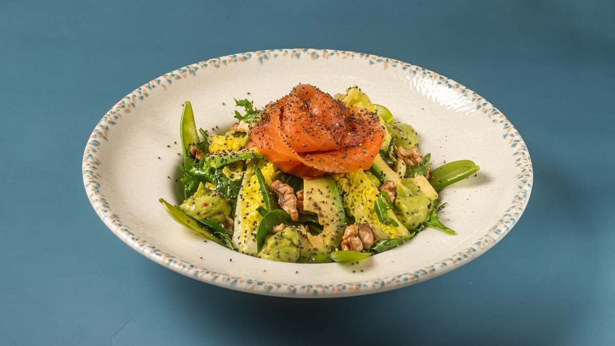 Με γουακαμόλε, αυγό ποσέ, ρόκα, ημίλιαστο ντοματίνι, flakes παρμεζάνας, τραγανό προσούτο, λάδι βασιλικού και δροσερή σαλάτα