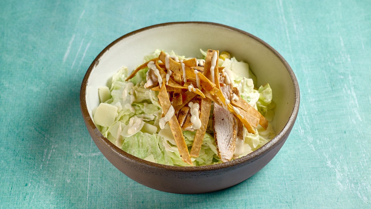 Σαλάτα με iceberg , ψητό κοτόπουλο, crispy tortillas , καλαμπόκι , παρμεζάνα και caesar dressing