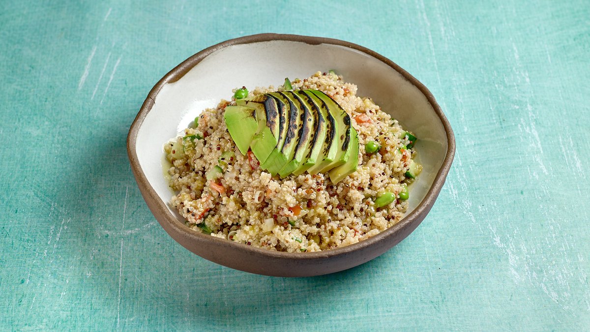 Σαλάτα με τρίχρωμη κινόα, αγγούρι, καψαλισμένο αβοκάντο, pico de gallo, edamame και dressing βαλσάμικου