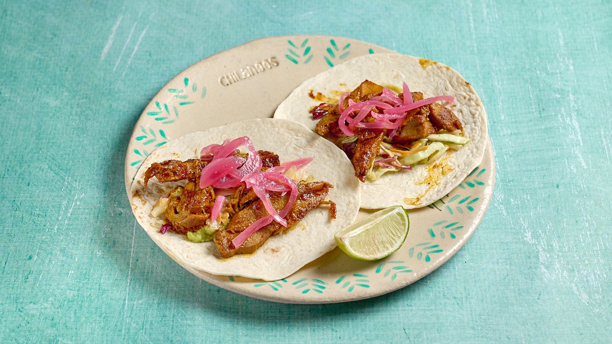 2 τεμάχια.Tortilla με παραδοσιακό χοιρινό pibil, guacamole, Mexican coleslaw και πίκλα κρεμμύδι