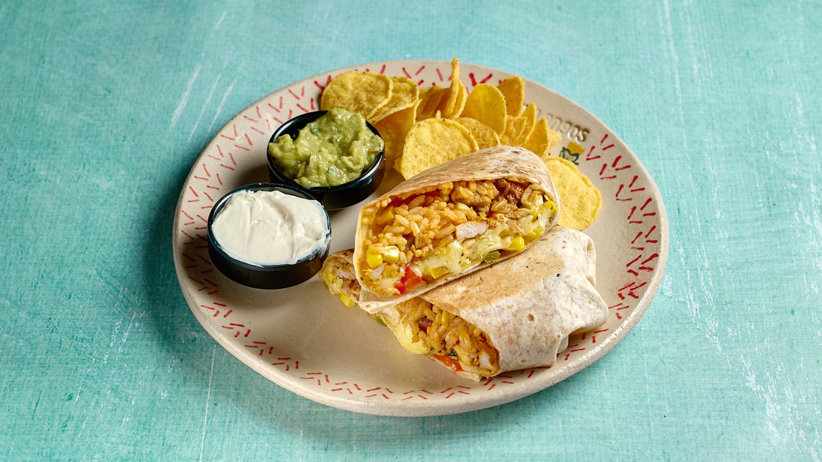 Παραδοσιακή tortilla με μπούτι κοτόπουλο achiote, mexican rice, πιπεριές, καλαμπόκι και φρεσκοτριμμένα τυριά. Σερβίρεται με guacamole και sour cream
