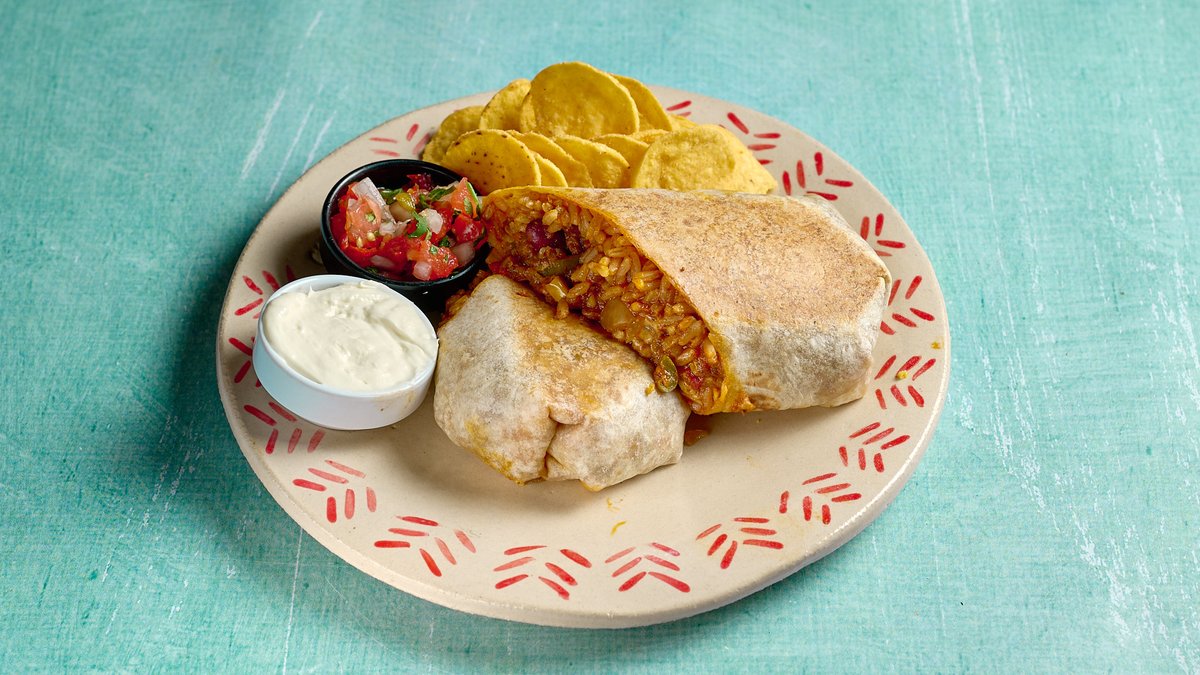 Παραδοσιακή tortilla με φρέσκο κιμά, mexican rice, λαχανικά και μείγμα τυριών. Σερβίρεται με pico de gallo και sour cream