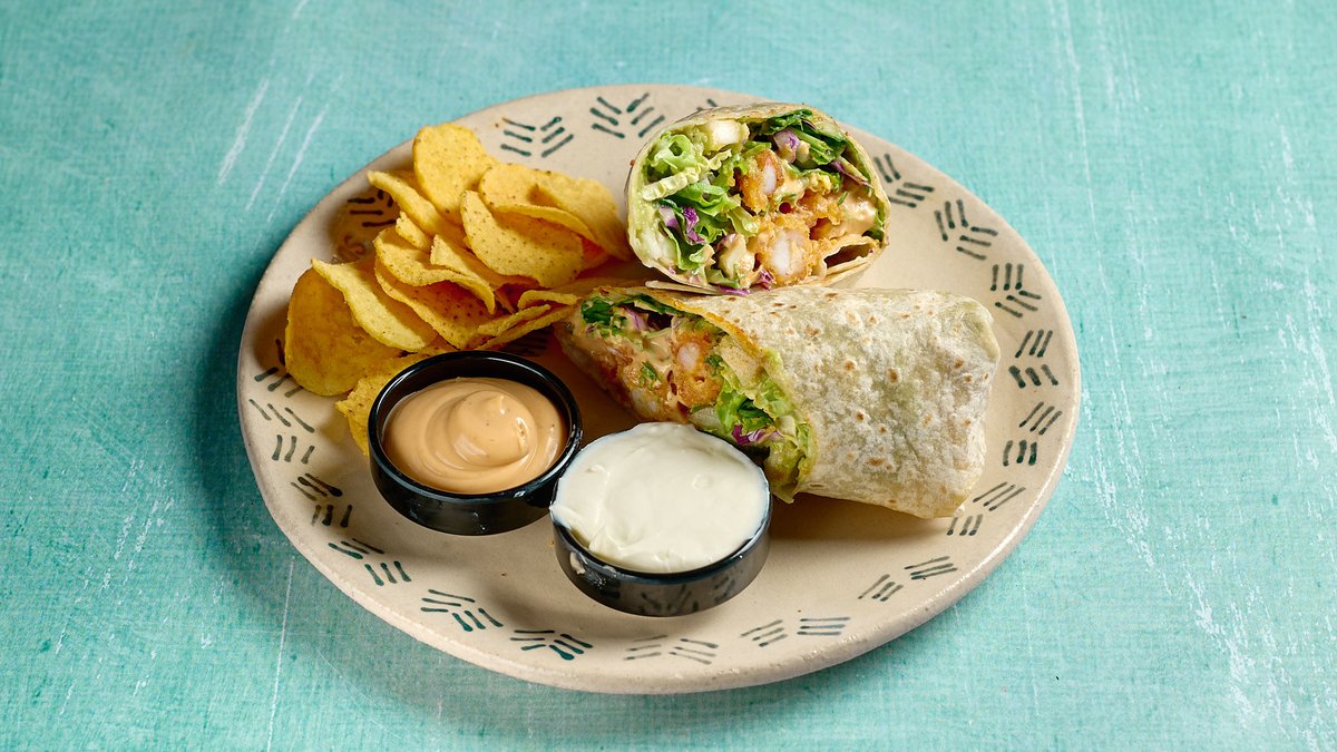 Tortilla με crispy γαρίδες παναρισμενες σε panko, guacamole, chipotle mayo και φρέσκα φύλλα σαλάτας. Σερβίρεται με sour cream και chipotle mayo