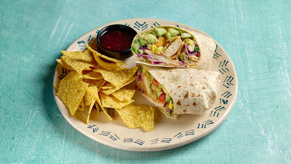 Tortilla με τραγανά nuggets πανέ από σόγια, φρέσκα φύλλα, guacamole, λαχανικά και vegan honey sriracha mayo