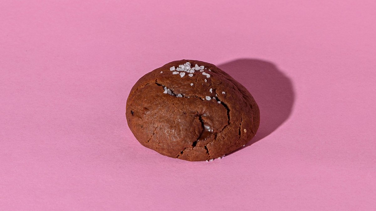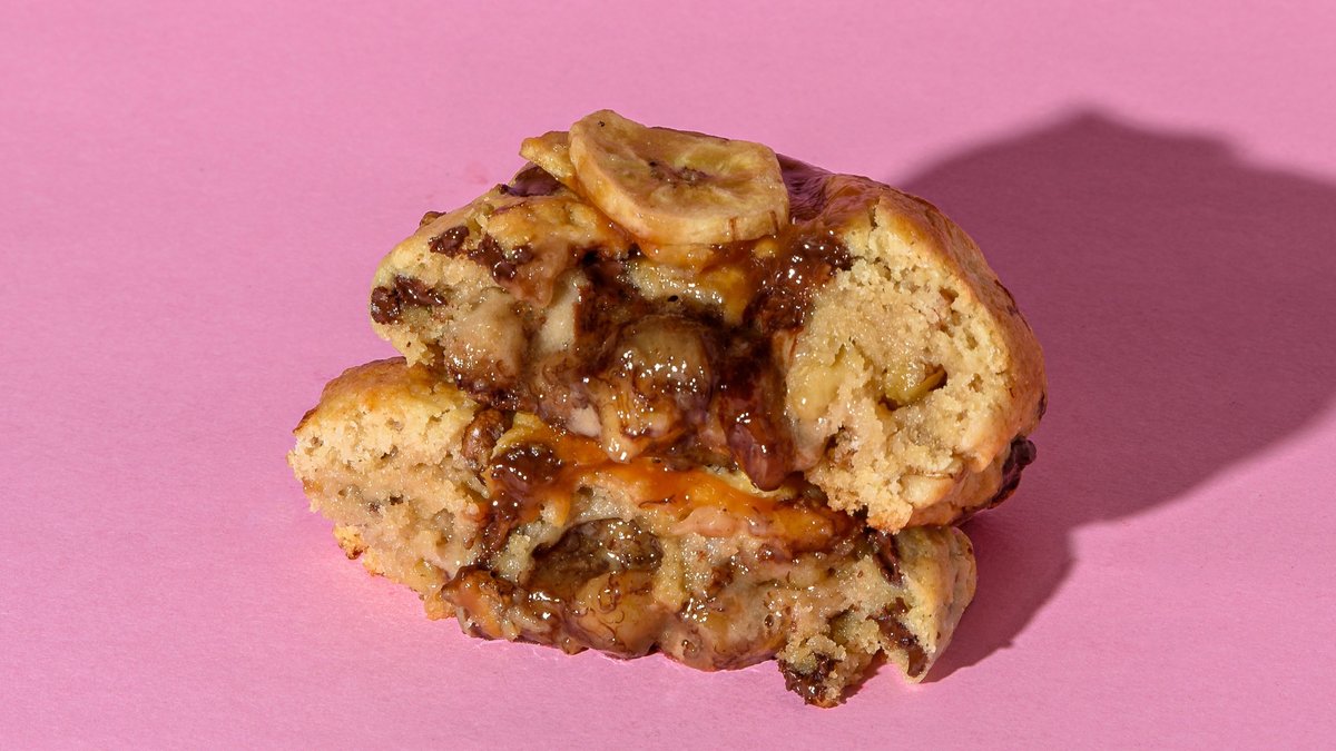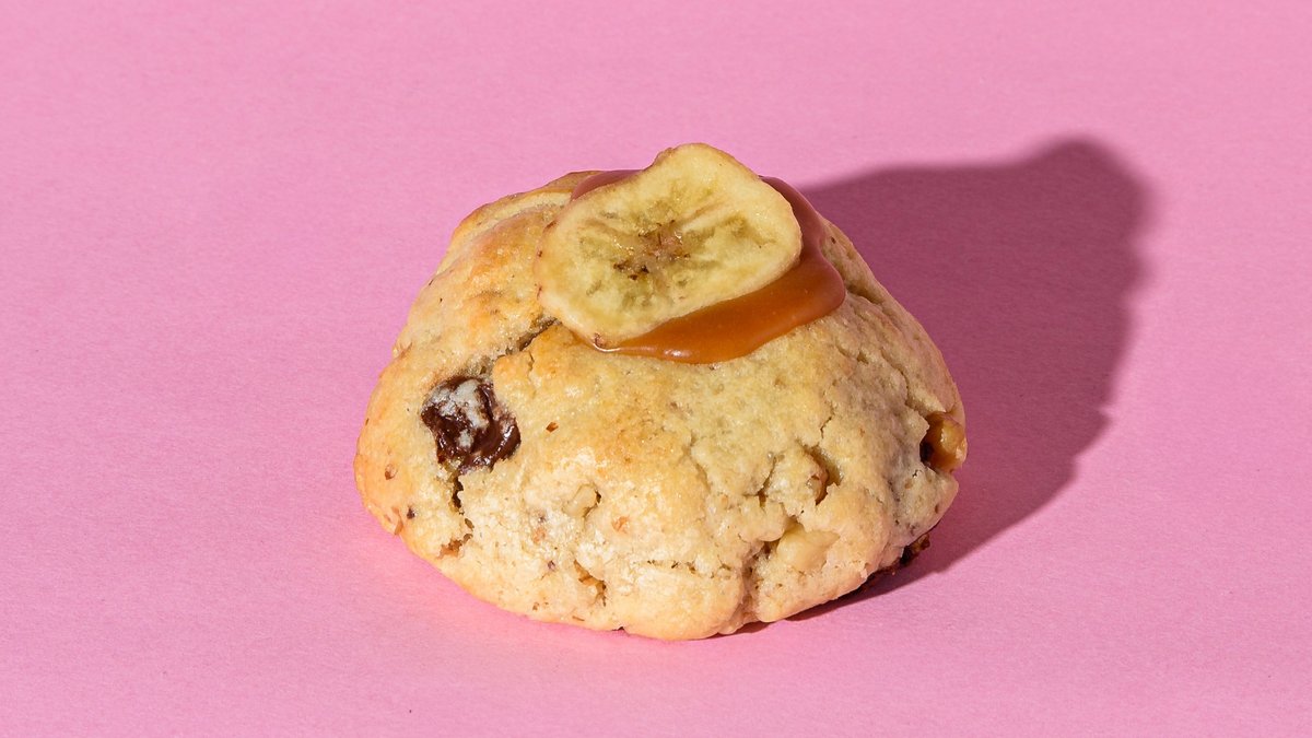 Our 120gr chunky cookie with dark chocolate chips, caramelised banana and a pinch of cinnamon, topped with caramel.