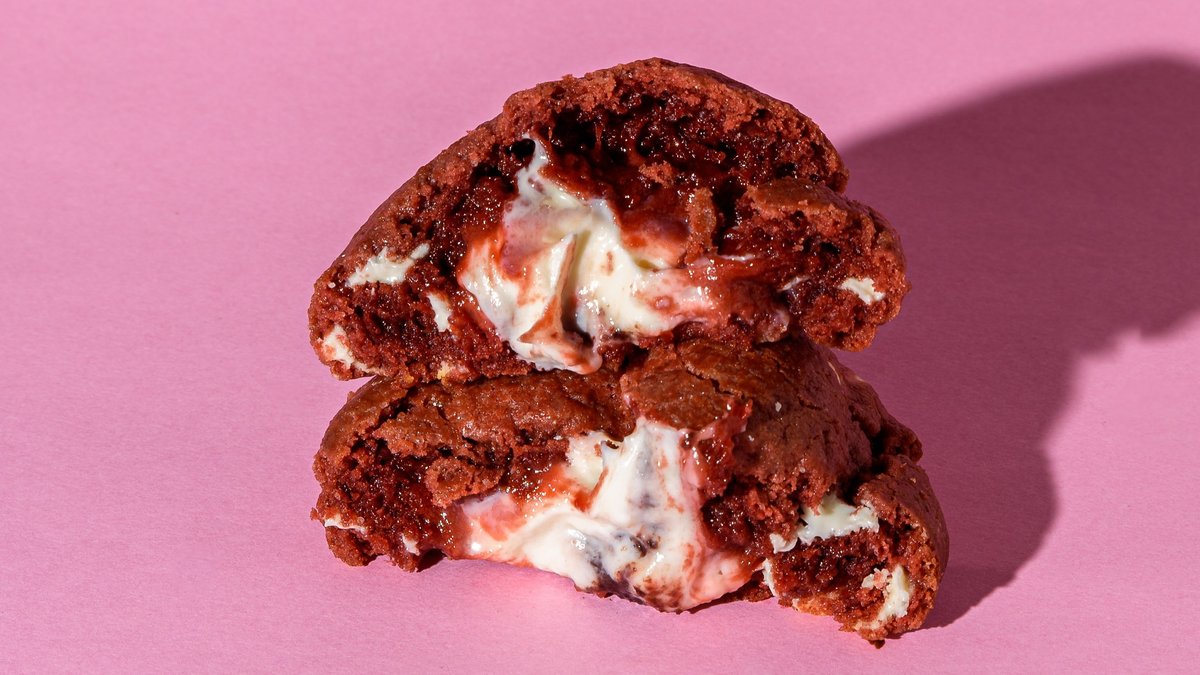 Our 120gr red velvet chunky cookie filled with cream cheese and forest fruit jam