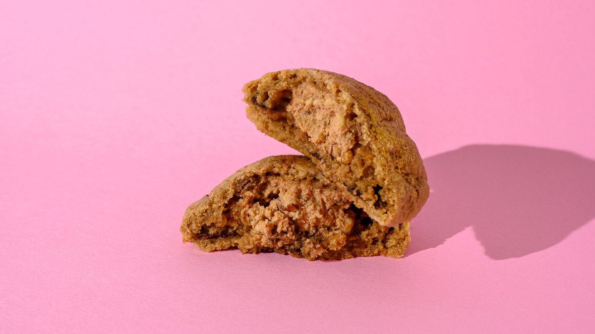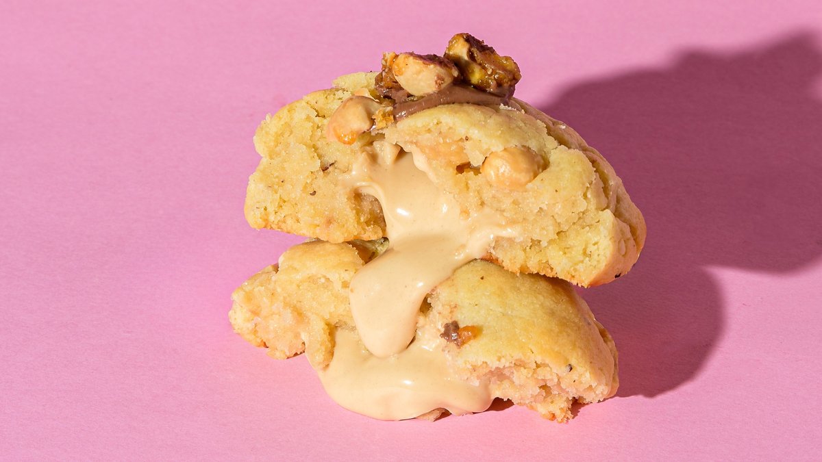 Our 60gr chunkito cookie filled with pistachio praline, white chocolate chips and pistachios