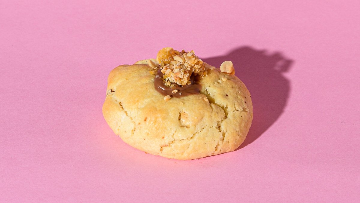 Our 120gr chunky cookie filled with bueno praline and chopped hazelnuts. Topped with hazelnut praline and kinder bueno