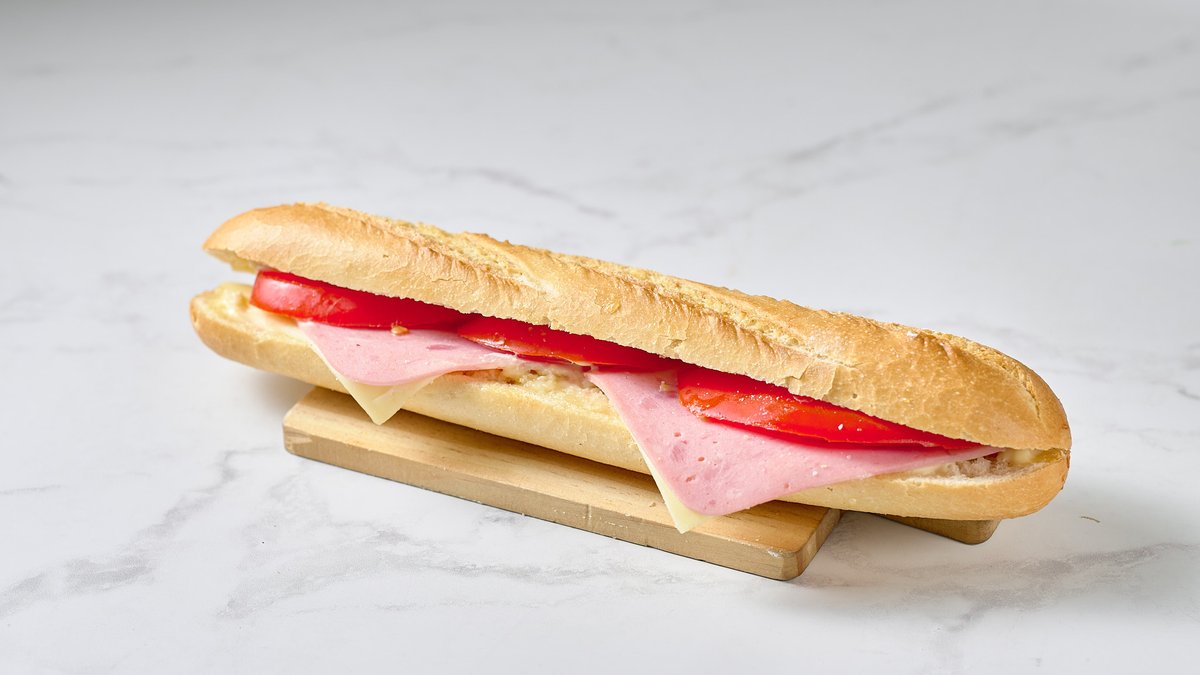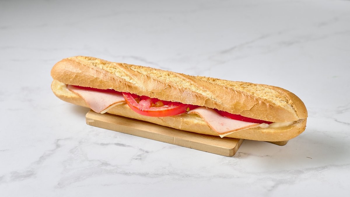 Με ζαμπόν, μπέικον, gouda, ντομάτα, μαρούλι και μαγιονέζα. Συνοδεύεται από πατάτες τηγανητές