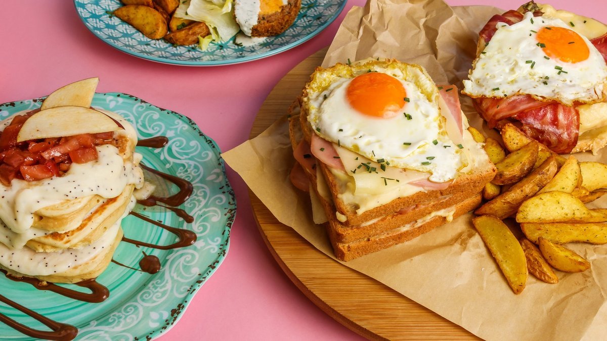 Μπέικον, αυγό, γραβιέρα, ντοµάτα, sauce γλυκιά µουστάρδα