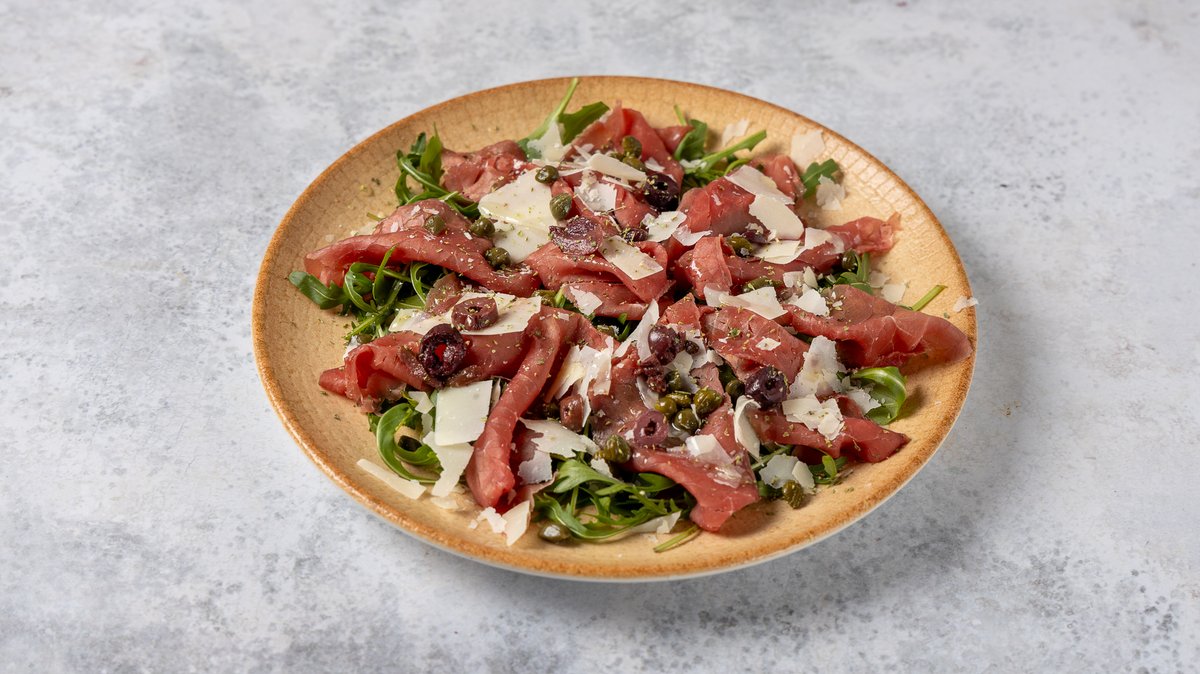Μοσχαρίσιο καρπάτσιο σε περιτύλιγμα φρέσκων μυρωδικών με ελιές Καλαμών, κάππαρη & φλοίδες παρμεζάνας. Συνοδεύεται από χειροποίητο ψωμάκι