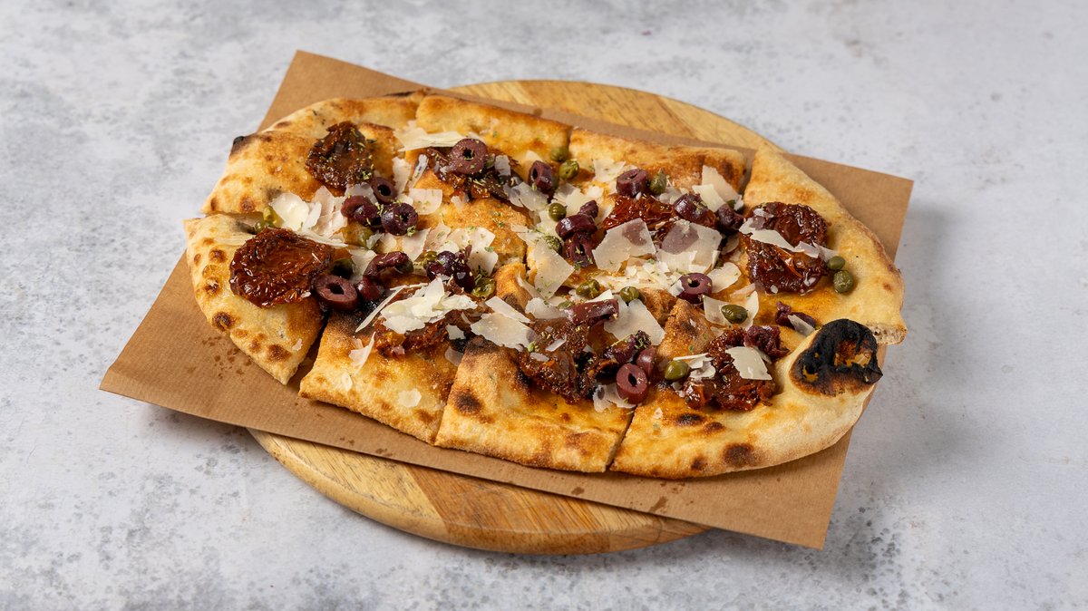 Focaccia με φλούδες παρμεζάνας, ελιές Καλαμών, λιαστή ντομάτα, κάπαρη και άγρια ρίγανη