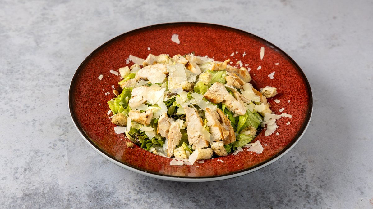 Σαλάτα Ceasar's με κοτόπουλο, κρουτόν, παρμεζάνα και βελούδινη dressing. Συνοδεύεται από χειροποίητο ψωμάκι