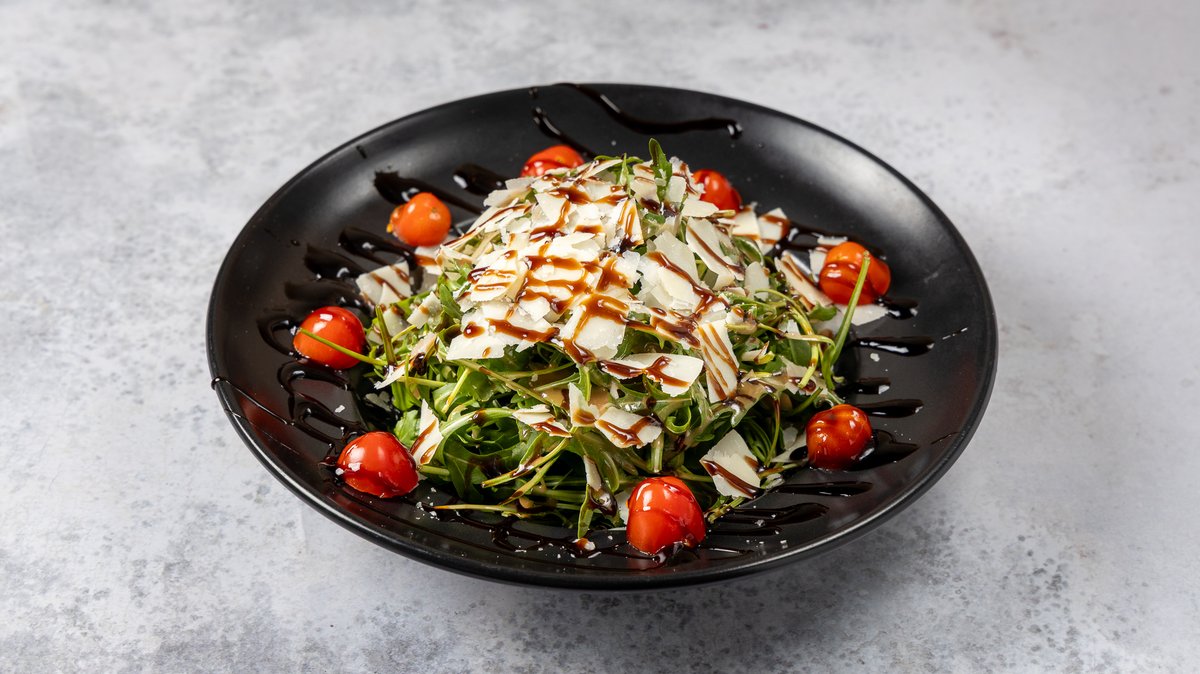 Baby ρόκα με ντοματίνια, παρμεζάνα και βελούδινη σπιτική βινεγκρέτ βαλσάμικου