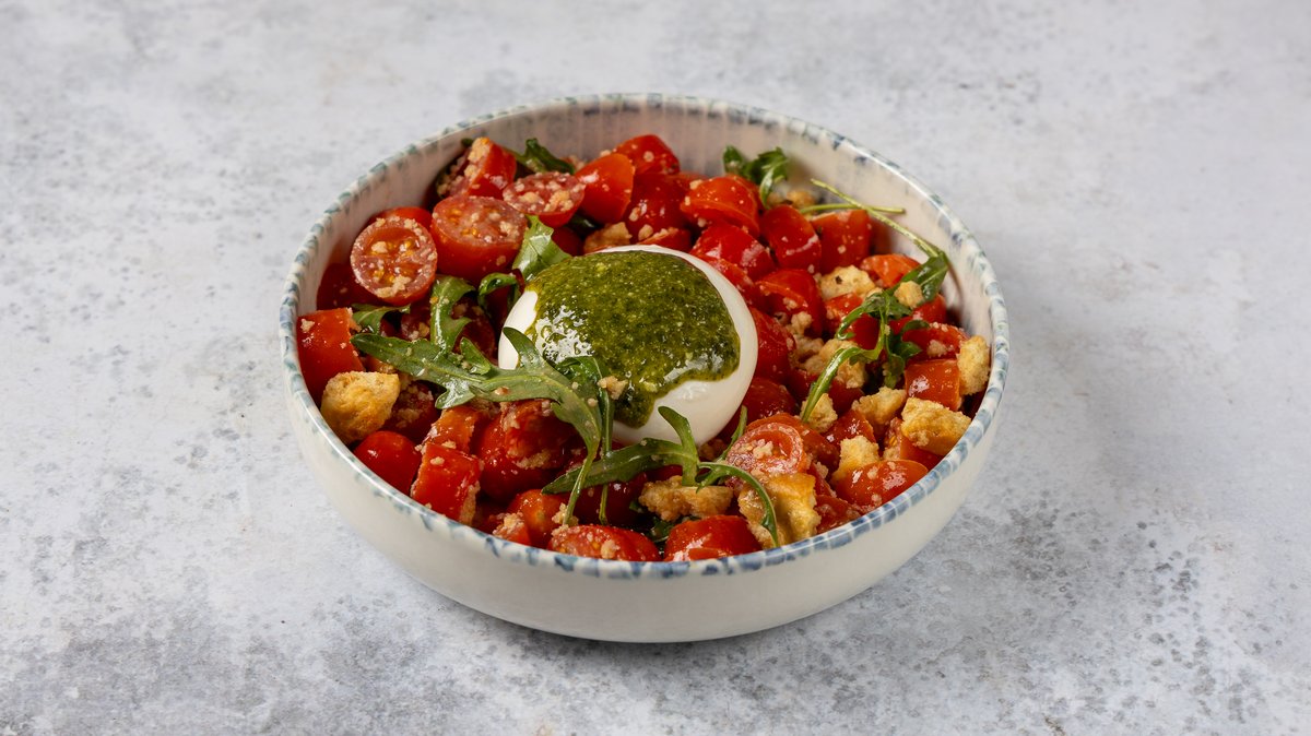 Φρέσκια burrata με ντοματίνια, κρίθινο παξιμαδάκι, βελούδινη βινεγκρέτ και πέστο βασιλικού