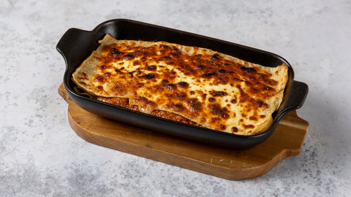 Λαζάνια χειροποίητα ψημένα στο ξυλόφουρνο με μοσχαρίσιο κιμά ragu bolognese, σιγομαγειρεμένο για 6 ώρες και κρέμα μοτσαρέλας