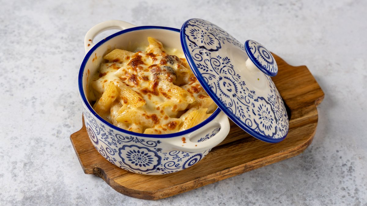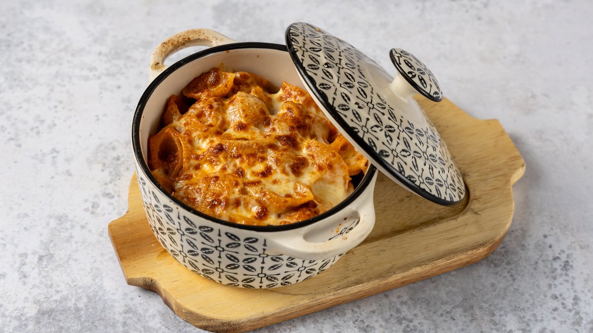Κοχύλια ψημένα στο ξυλόφουρνο με μοσχαρίσιο κιμά ragu bolognese, σιγομαγειρεμένο για 6 ώρες και κρέμα μοτσαρέλας