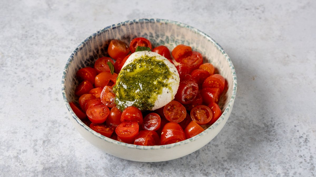 Σαλάτα με ντομάτα, πέστο βασιλικού και βουβαλίσια μοτσαρέλα. Συνοδεύεται από χειροποίητο ψωμάκι