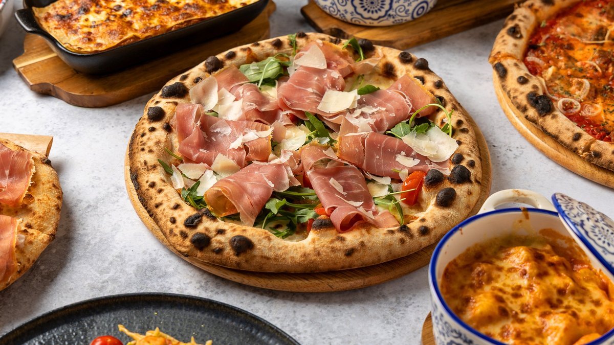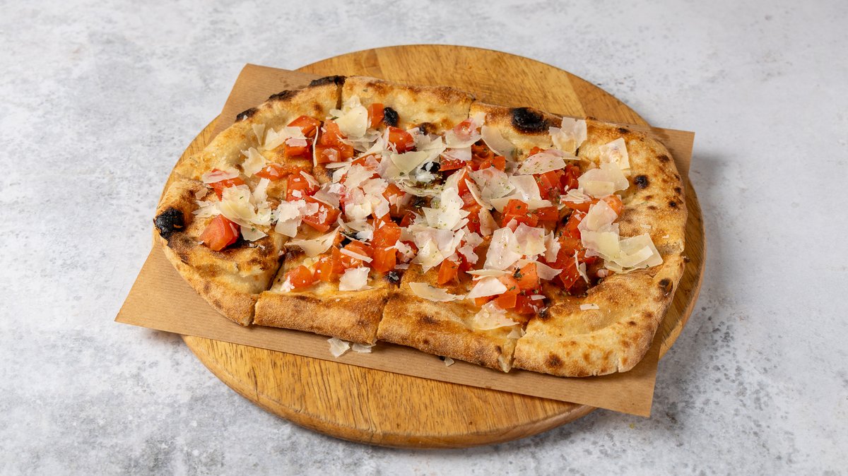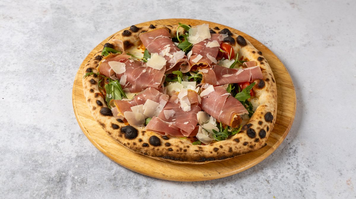 Πίτσα λευκή με βουβαλίσια μοτσαρέλα, προσούτο Πάρμας, άγρια ρόκα, ψημένα ντοματίνια και παρμεζάνας φλούδες