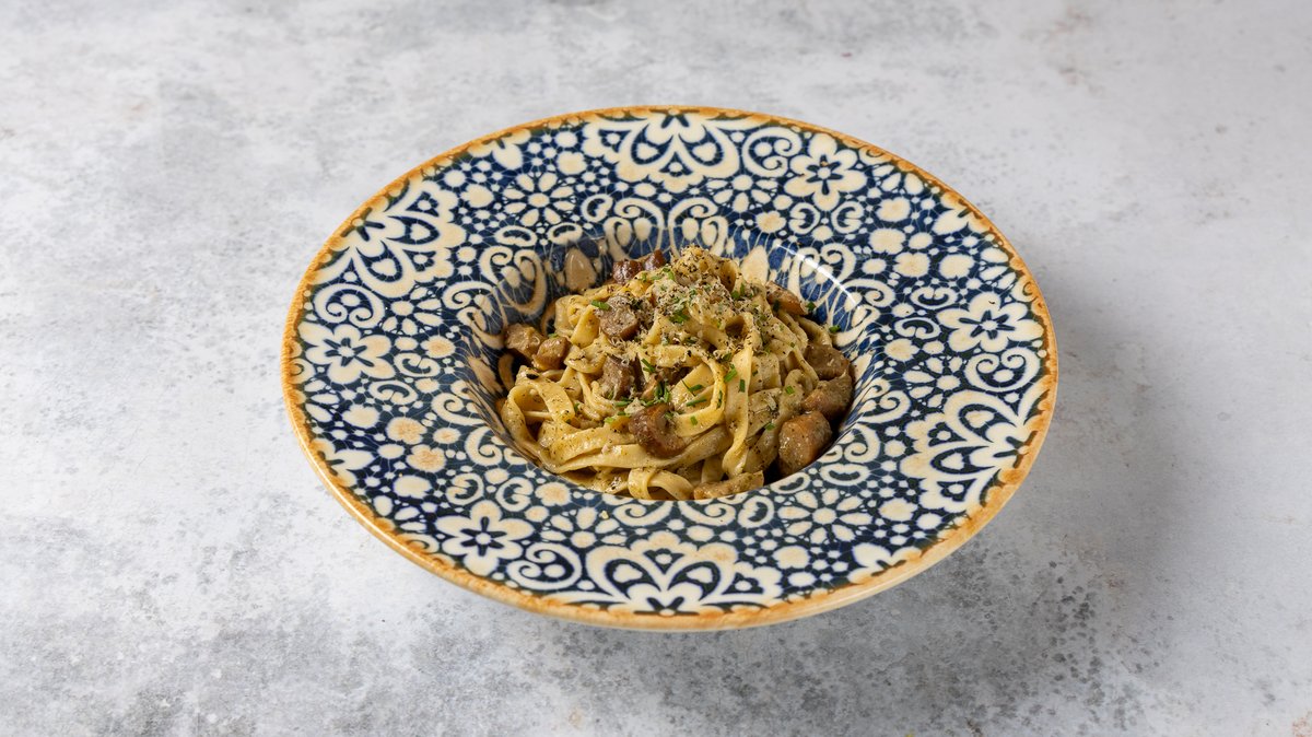 Πέννες με κρέμα, μανιτάρια και λεπτοκομμένη Ιταλική πανσέτα. Συνοδεύεται από χειροποίητο ψωμάκι