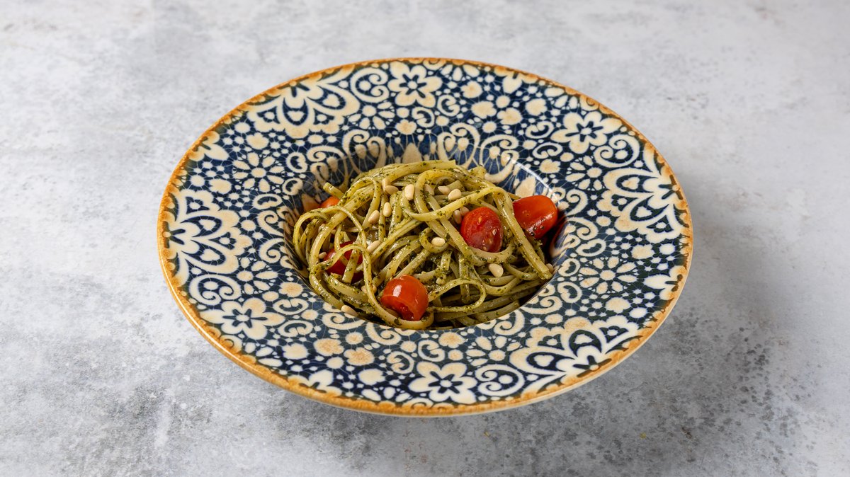 Με χειροποίητη σάλτσα pesto βασιλικού, κουκουνάρι και ντοματίνια. Συνοδεύεται από τριμμένη παρμεζάνα και χειροποίητο ψωμάκι