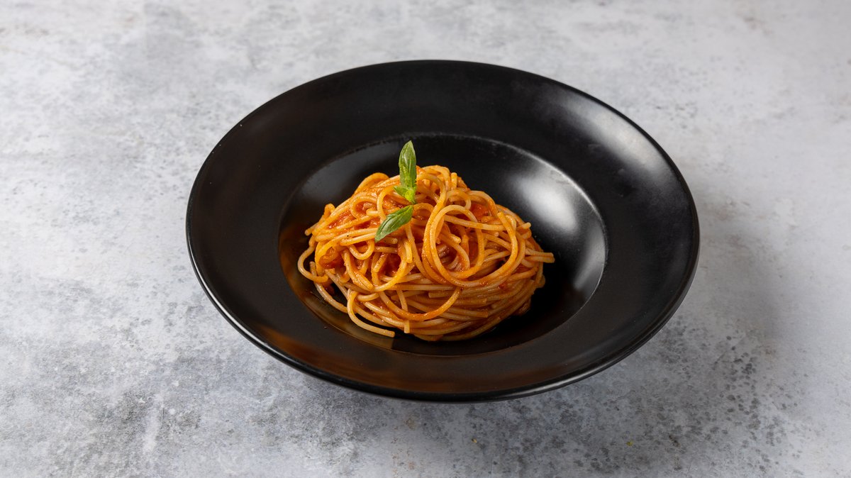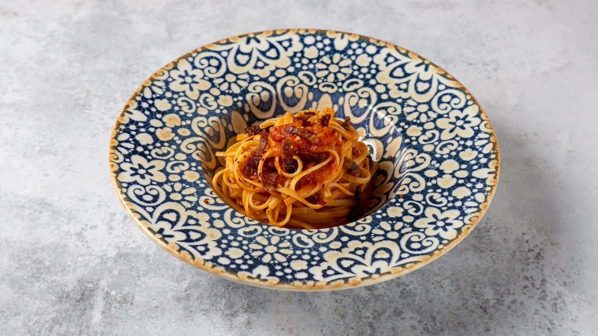 Με κόκκινη σάλτσα San Marziano, πανσέτα και καυτερή πιπεριά. Συνοδεύεται από τριμμένη παρμεζάνα και χειροποίητο ψωμάκι