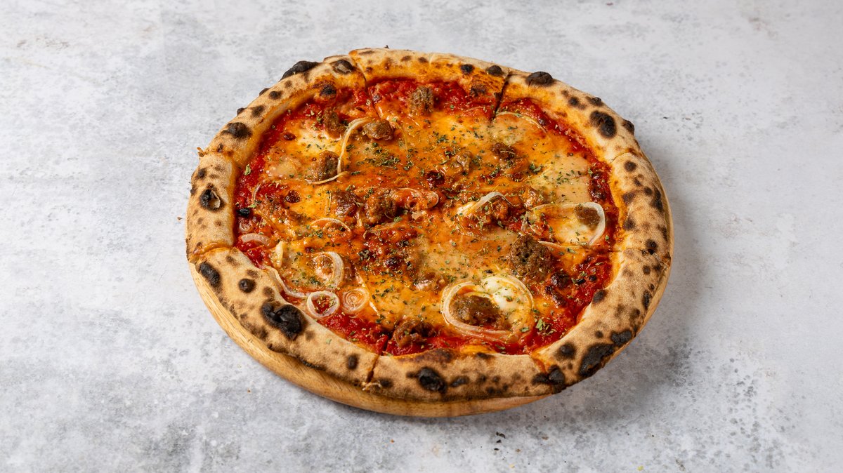 Πίτσα με σάλτσα San Marzano, φρέσκια μοτσαρέλα, ιταλική salsiccia, gorgonzola, κρεμμύδι tropea και άγρια ρίγανη