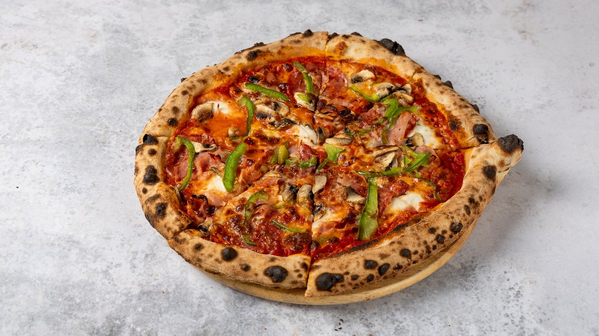 Με σάλτσα San Marziano, μανιτάρια, πράσινη πιπεριά, σαλάμι Νάπολι, λεπτοκομμένη πανσέτα και ιταλικό ζαμπόν