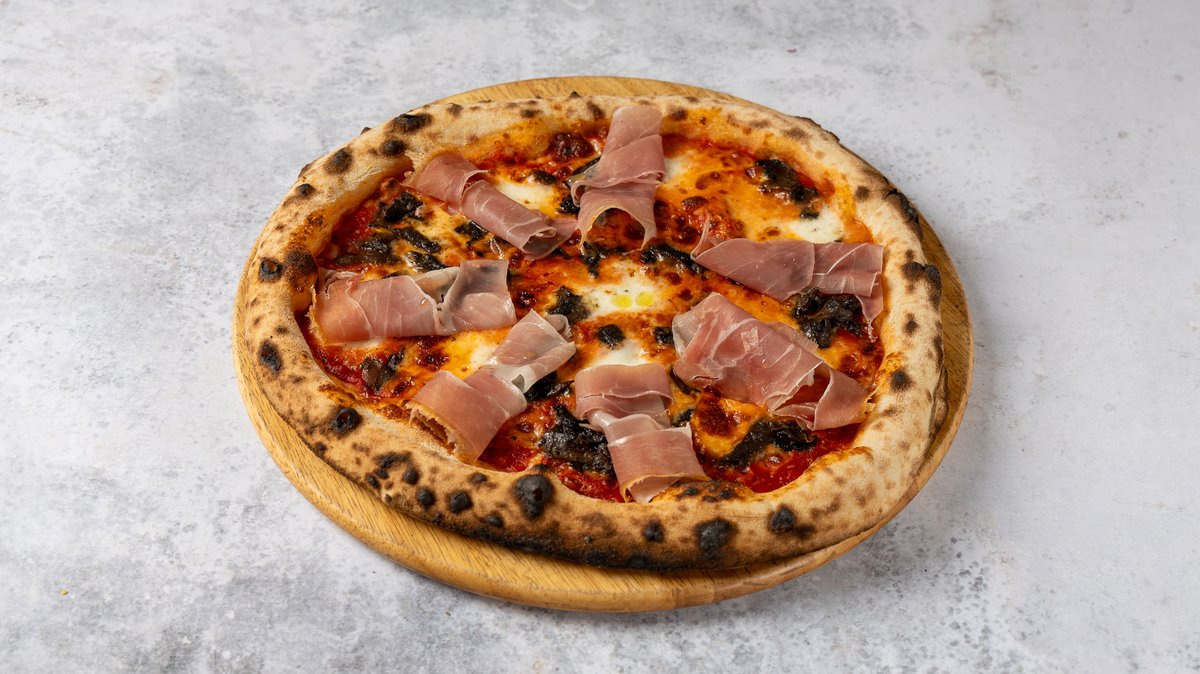 Με σάλτσα San Marziano, ιταλική αυθεντική μοτσαρέλα, άγρια μανιτάρια, προβολόνε, προσούτο Πάρμας και λάδι λευκής τρούφας