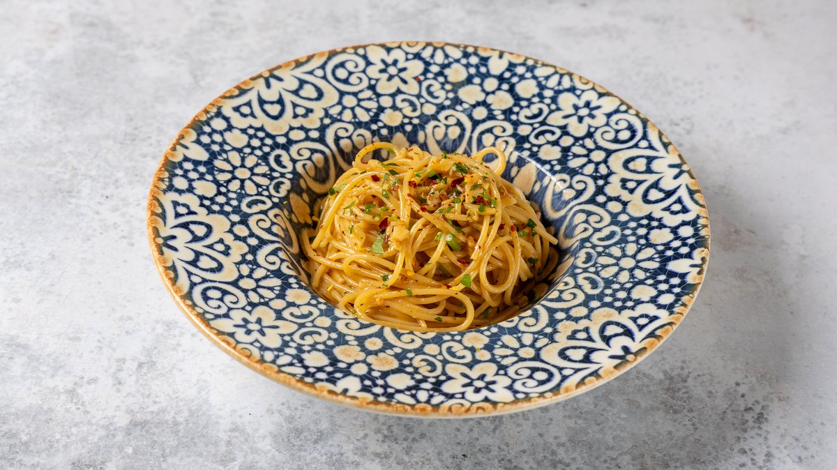 Με σκόρδο, λάδι, φρέσκο μαϊντανό και καυτερή πιπεριά. Συνοδεύεται από τριμμένη παρμεζάνα και χειροποίητο ψωμάκι