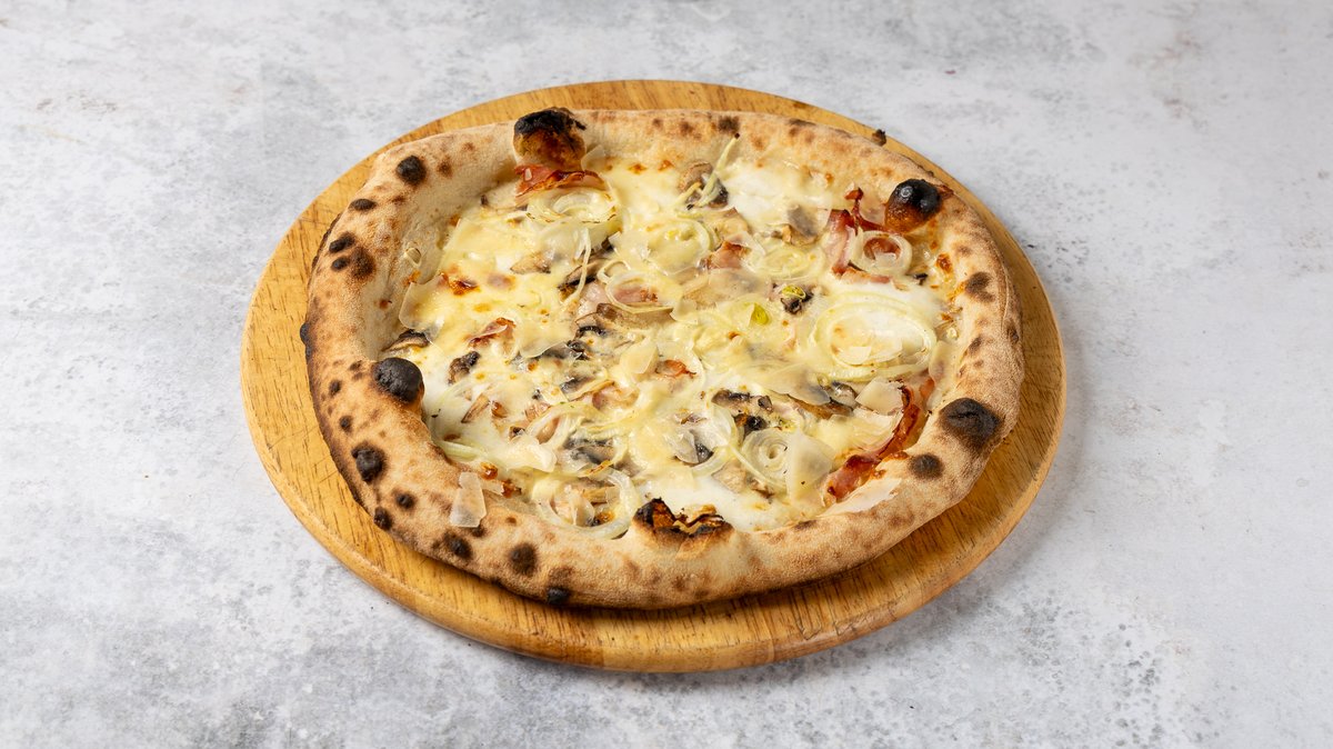Με λευκή κρέμα μοτσαρέλας, χοιρινή πανσέτα, κρεμμύδι, μανιτάρια και παρμεζάνα