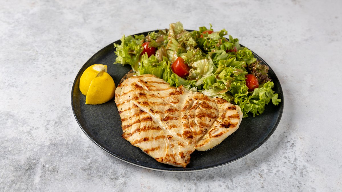 Φιλέτο κοτόπουλο σχάρας με χειροποίητη μαρινάδα. Συνοδεύεται από πράσινη ανάμεικτη σαλάτα και χειροποίητο ψωμάκι
