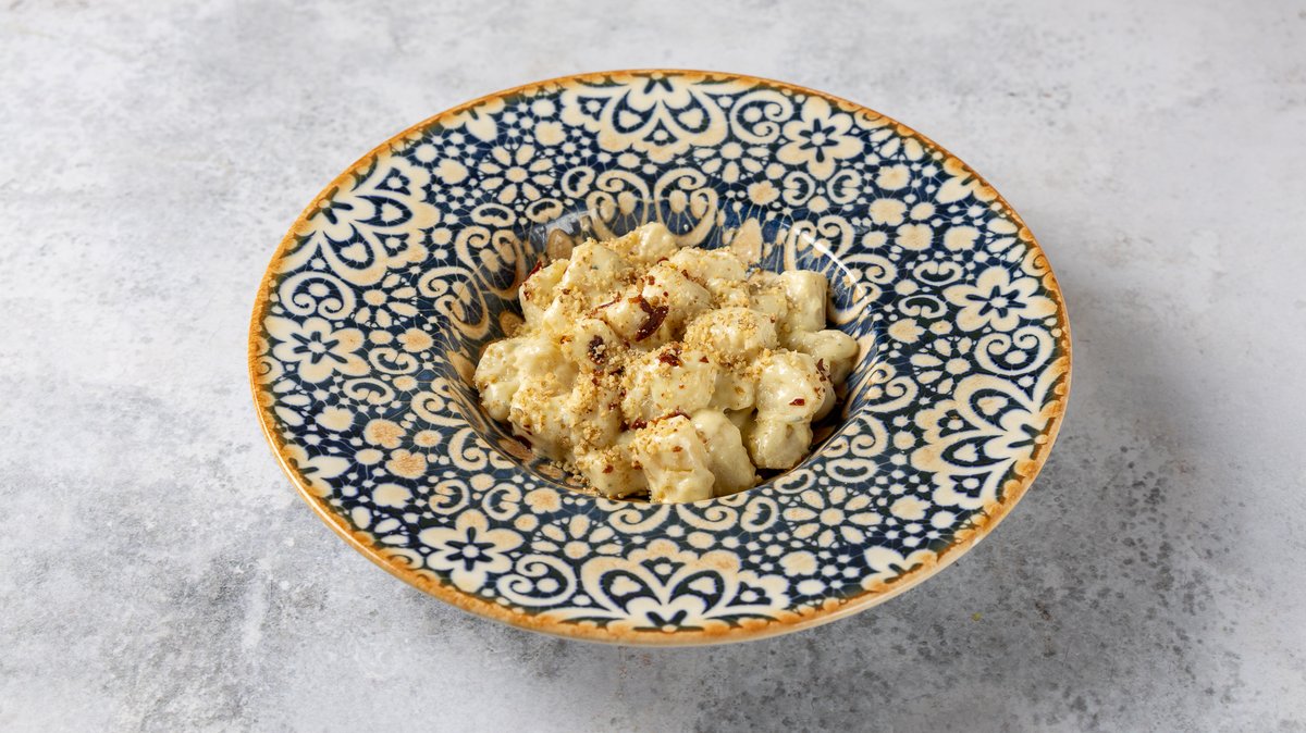 Νιόκι χειροποίητα με κρέμα γάλακτος, καρύδια, gorgonzola και τραγανό σπεκ. Συνοδεύεται από χειροποίητο ψωμάκι