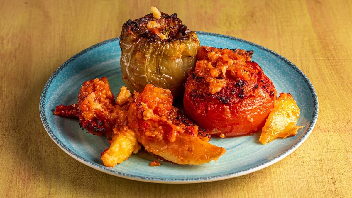 Με ντομάτα, πιπεριά, ρύζι καρολίνα, σταφίδες, κουκουνάρι και μυρωδικά. Συνοδεύεται από πατάτες