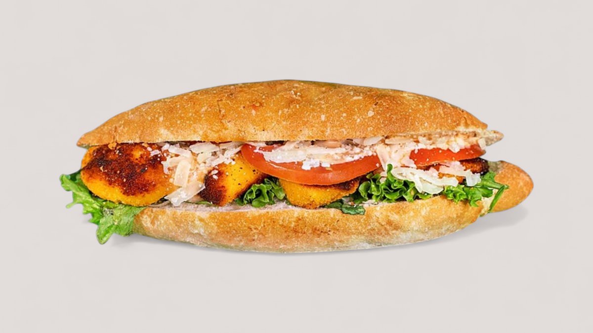 Με τυρί gouda, κοτομπουκιές, bacon, ντομάτα, μαρούλι και μαγιονέζα. Συνοδεύεται από πατάτες τηγανητές