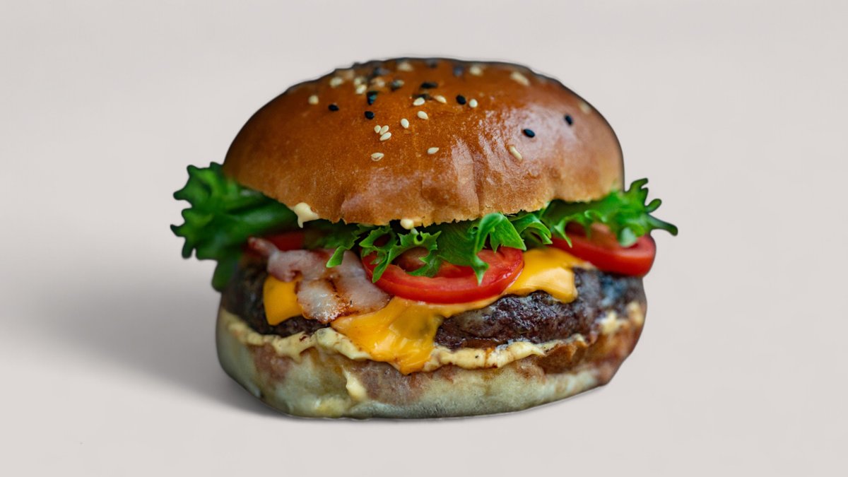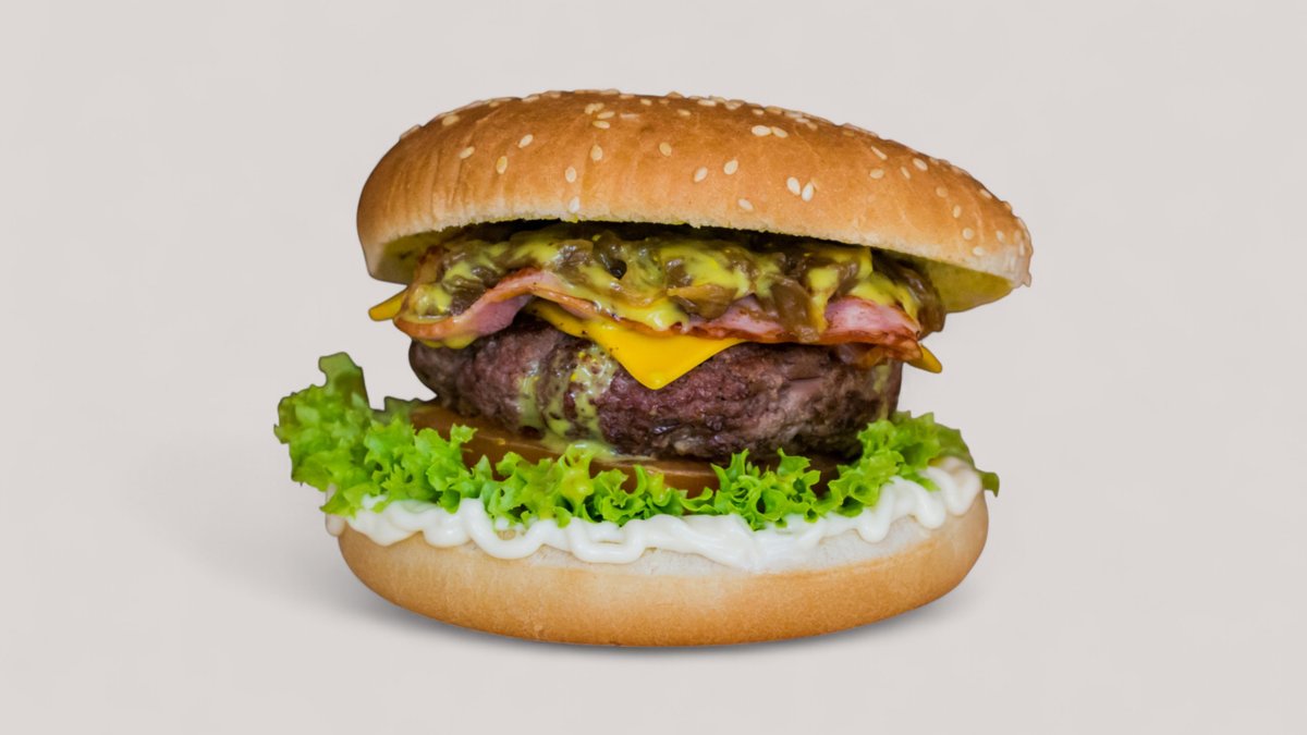 Με τυρί gouda, μπιφτέκι ανάμεικτο, bacon, ντομάτα, μαρούλι και μαγιονέζα. Συνοδεύεται από πατάτες τηγανητές