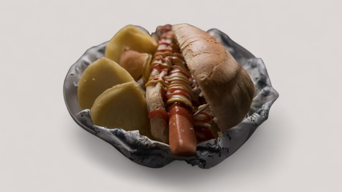 Με λουκάνικο Φρανκφούρτης, μαγιονέζα, ketchup, μουστάρδα και πατατάκια