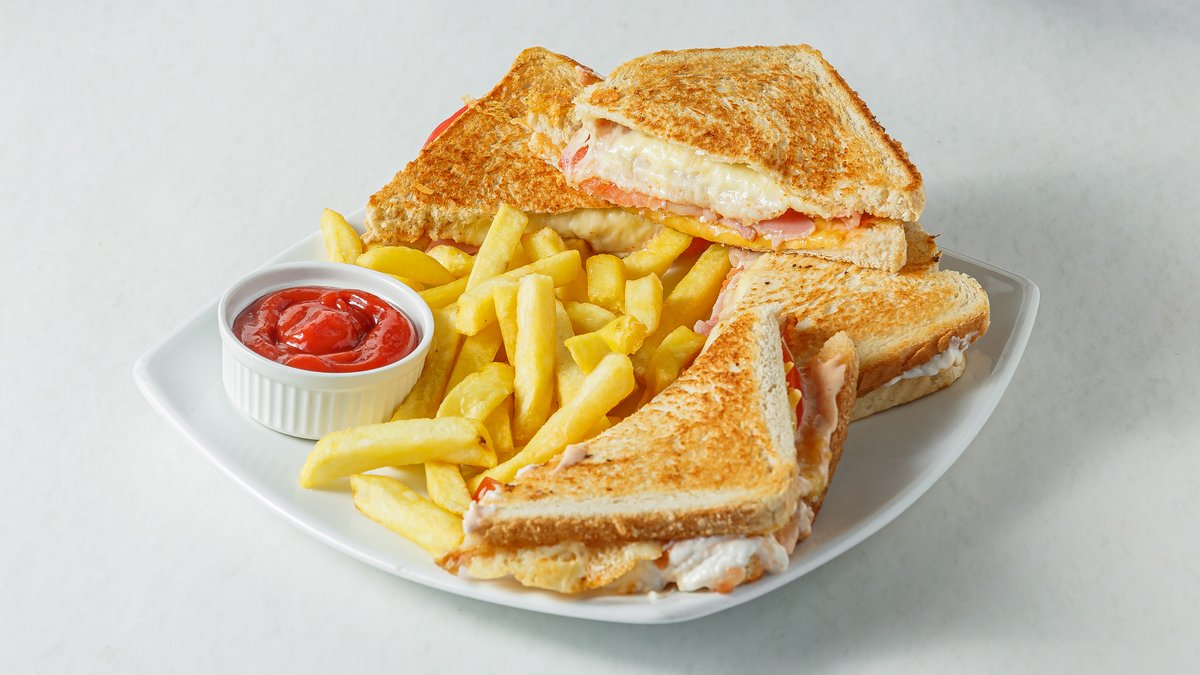Με μπιφτέκι, παρμεζάνα, μπέικον, μαρούλι και σως cocktail. Συνοδεύεται από πατάτες τηγανητές