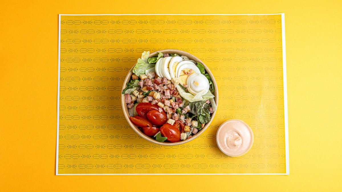 Σαλάτα με ζαμπόν, μαούλι, τυρί, ντομάτα, αυγό βραστό και σως