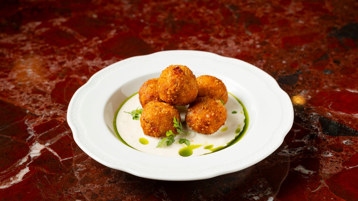 Κροκέτες από risotto με μοσχαρίσιο κιμά bolognese & κρέμα παρμεζάνα.