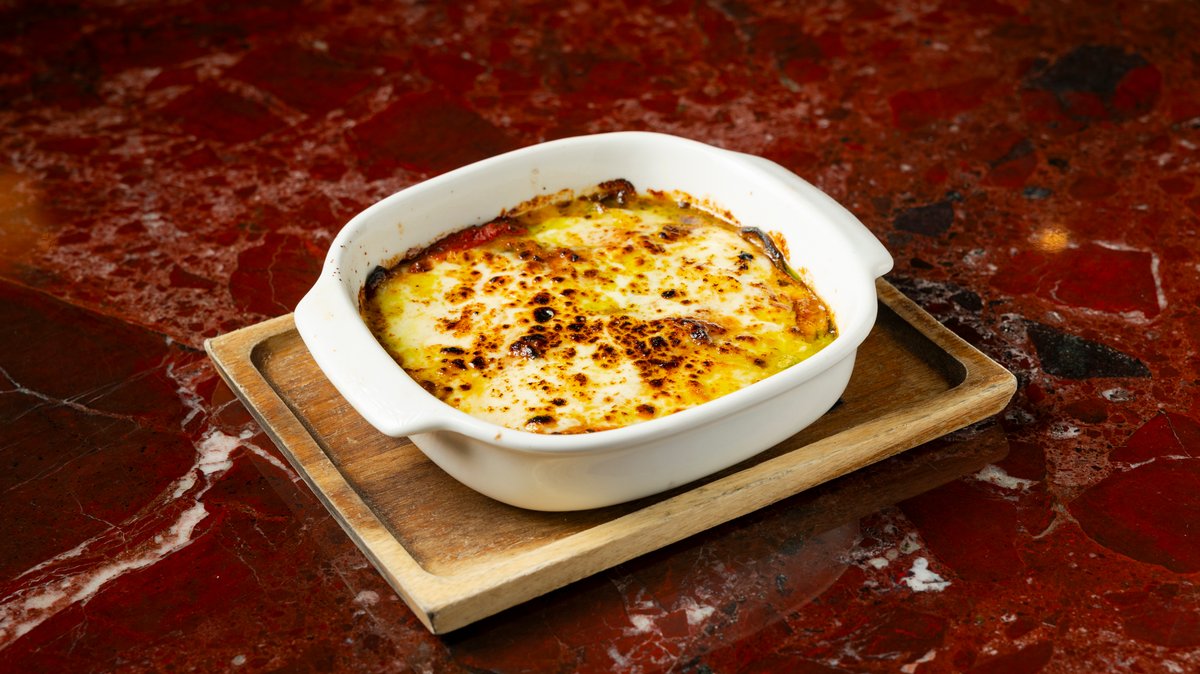 Μελιτζάνα, κρέμα παρμεζάνας, σάλτσα τομάτας, μοτσαρέλα fior di latte & βασιλικός