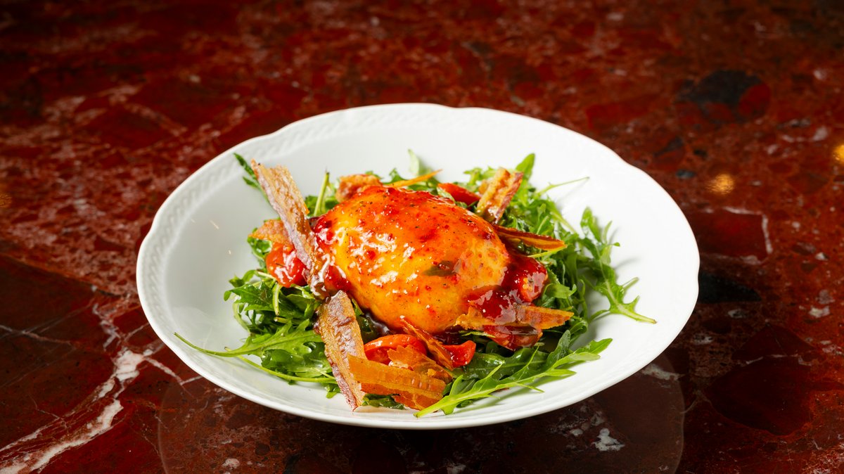 Mozzarella, καπνιστή pancetta, σάλτσα τομάτα San Marzano και κρόκος αυγού