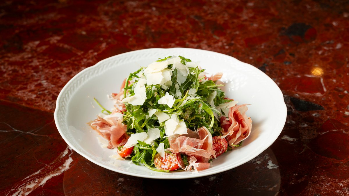 Baby ρόκα, prosciutto di Parma, grana padano, τοματίνια και vinaigrette balsamico