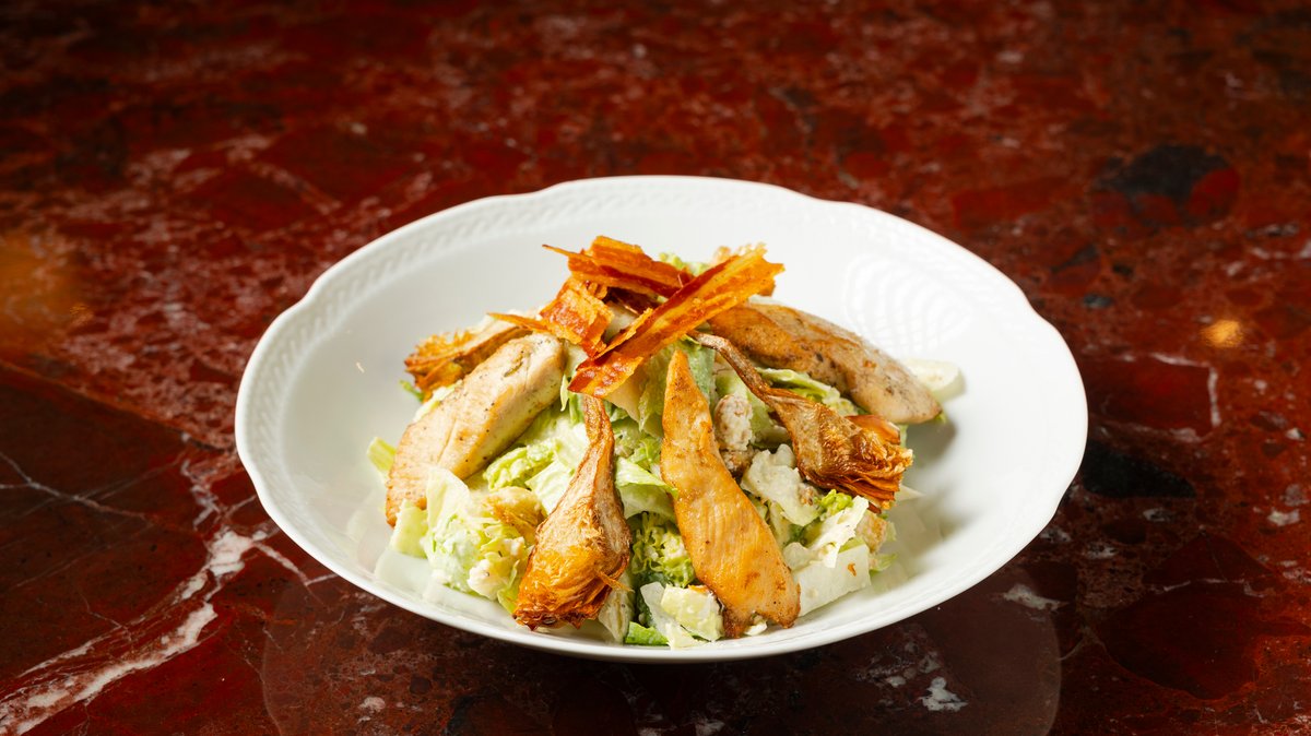 Iceberg, ψητό φιλέτο κοτόπουλο, καπνιστή pancetta, τραγανή αγκινάρα Romana, grana padano, croutons και Cesare sauce