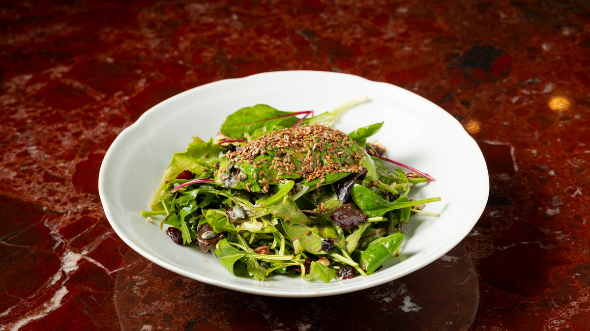 Σαλάτα mesclun, avocado, λευκό σταφύλι, goji berries, λιναρόσπορος, σταφίδες, καρύδια pecan & vinaigrette ροδιού.
