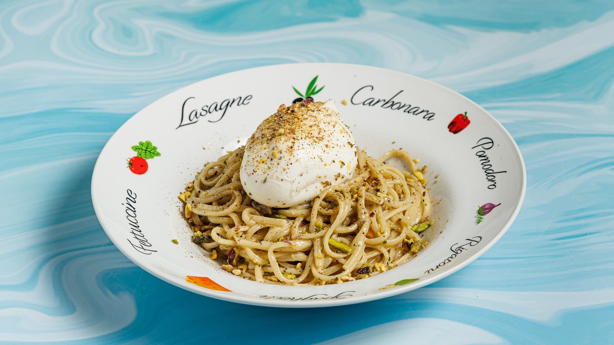 Πέστο βασιλικού, κρέμα,Buratta, παρμεζάνα, φυστίκι Αιγίνης