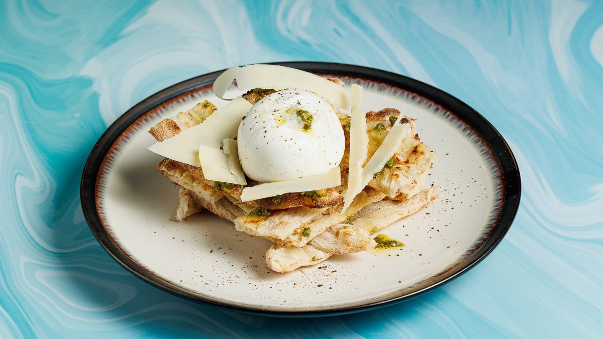 Με burrata fresca, ελαιόλαδο, ανθό αλατιού, πέστο βασιλικού και φοκάτσια