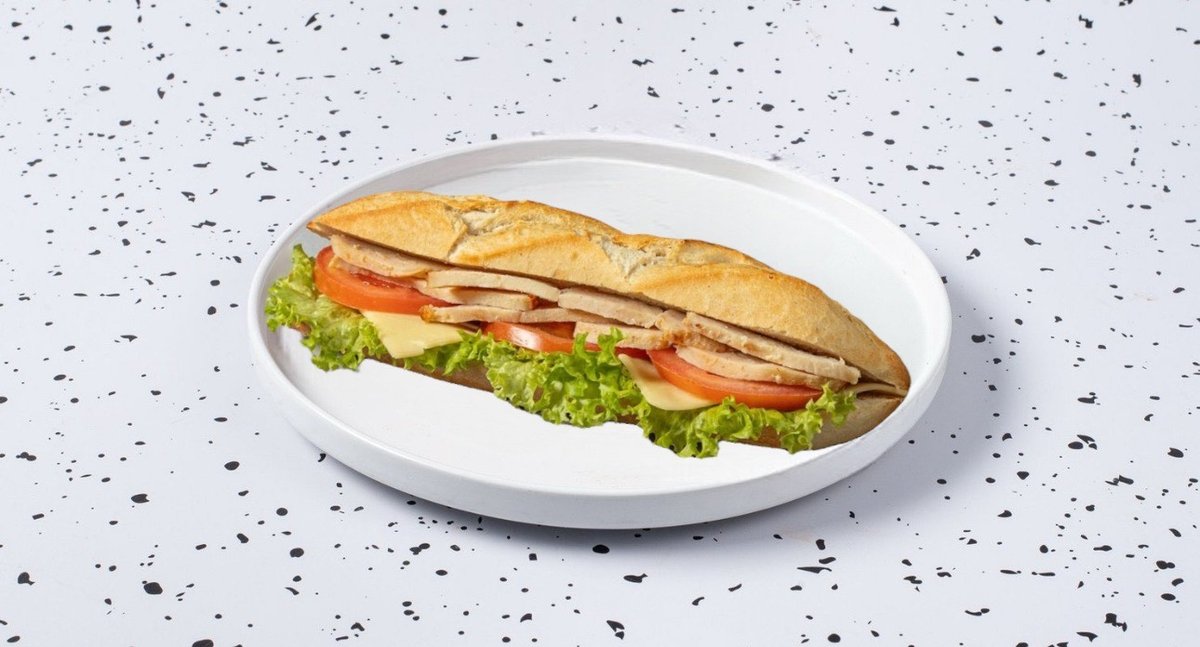 "Φρέσκο Sandwich Κοτόπουλο: Χειροποίητο ψωμί με gouda, νόστιμο κοτόπουλο λωρίδες ,ντομάτα & μαγιονέζα.
